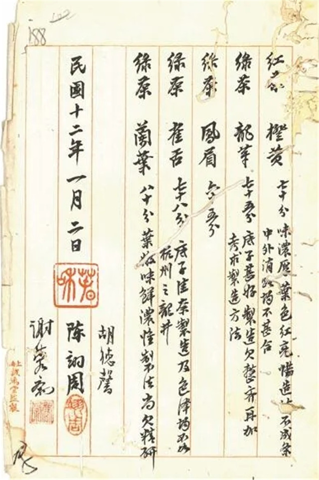 1922年11月,朱文精將實(shí)習(xí)所焙制的5種茶樣交實(shí)業(yè)司,轉(zhuǎn)送上??偵虝?huì)延請(qǐng)專家評(píng)定。擔(dān)任上??偵虝?huì)展覽會(huì)茶葉審查員的胡德馨、陳翊周、謝蓉齋3位茶業(yè)專家在詳細(xì)查驗(yàn)品評(píng)茶樣后,聯(lián)合出具了報(bào)告書。報(bào)告書記載,5份茶樣,合紅茶1份,綠茶4份,分別是橙黃、龍華、鳳眉、雀舌、蘭葉。其中蘭葉“葉嫩味鮮濃”得分最高,獲得80分??傮w來(lái)看,專家們認(rèn)為茶業(yè)實(shí)習(xí)所送評(píng)的茶葉,無(wú)論紅茶還是綠茶,茶葉的底子都好,但制法上尚欠精研,還需提高。