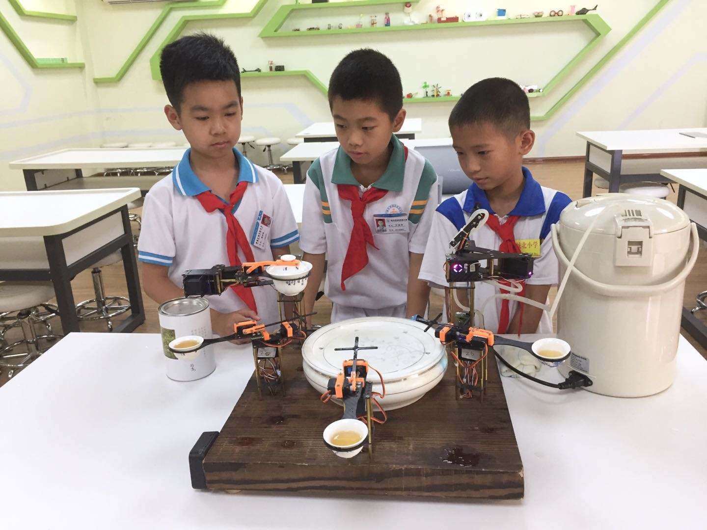 三個(gè)潮汕小朋友甚至還發(fā)明了一個(gè)自動(dòng)沖茶的小機(jī)器人。