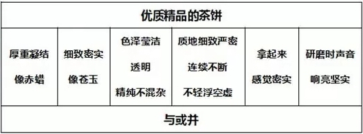 有的茶餅表面光彩而內在灰暗,也有的茶餅內里實在潔凈而外表質樸。茶餅外表如同人的容貌各不相同,很難一概而論??偠灾?,色澤瑩潔透明并且顏色不混雜,質地細致嚴密而不輕浮,拿起來感覺密實,碾碎時聲音清亮,這些都可以表明是精品好茶。茶葉的鑒別,有的可以通過具體的言語和意旨來表達,有的只能心中領會了。