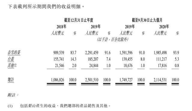 招股書(shū)顯示,2018年、2019年,奈雪的茶營(yíng)業(yè)收入分別為9.1億元,22.91億元,2019年前三季度、2020年前三季度營(yíng)收分別為15.92億元、19.85億元,2019年之后,該業(yè)務(wù)營(yíng)收貢獻(xiàn)占營(yíng)收總金額的比例提升至91%以上。