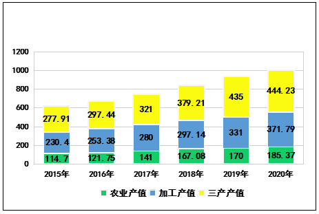 圖5  2015-2020年云南省茶產(chǎn)業(yè)結(jié)構(gòu)趨勢圖(億元)
