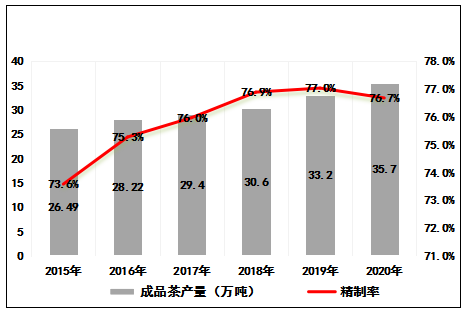 圖3 2015-2020年云南省成品茶產(chǎn)量趨勢圖及精制率變化圖