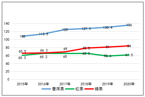 2020年,普洱茶平均單價(jià)139元/千克,比2019年增長4.3%,紅茶平均單價(jià)61.5元/千克,比2019年增長4.9%,綠茶平均單價(jià)84元/千克,比2019年增長3.7%。“十三五”期間,普洱茶、綠茶價(jià)格年均增長率分別為4.7%、5.1%,均呈穩(wěn)步增長,紅茶年均增長僅0.4%。