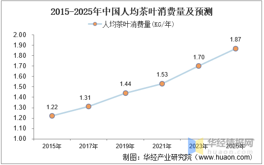 茶始終是中國消費(fèi)者現(xiàn)制飲料消費(fèi)的最大品類,茶葉消費(fèi)市場規(guī)模依然遠(yuǎn)高于近年來在中國快速增長的咖啡市場:2019年中國茶葉銷售額達(dá)2740億元,遠(yuǎn)高于咖啡678億元的市場規(guī)模。從人均茶葉消費(fèi)量來看,2015-2019年人均消費(fèi)量持續(xù)增長,由1.22千克/年增長至1.44千克/年,預(yù)計(jì)未來將維持增長態(tài)勢,2025年可達(dá)到1.87千克/年。