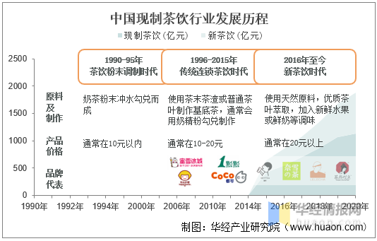 中國現(xiàn)制茶飲行業(yè)走過來三個(gè)階段:1990-1995的茶飲粉末調(diào)制時(shí)代;1996-2015年的傳統(tǒng)連鎖茶飲時(shí)代,以蜜雪冰城、一點(diǎn)點(diǎn)、COCO等品牌為代表;2016年至今的新茶飲時(shí)代,以奈雪的茶、喜茶、茶顏悅色等品牌為代表。