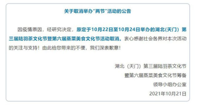 據(jù)湖北(天門(mén))第三屆陸羽茶文化節(jié)暨第六屆蒸菜美食文化節(jié)籌備領(lǐng)導(dǎo)小組辦公室最新公告,因疫情原因,經(jīng)研究決定,原定于10月22日至10月24日舉辦的湖北(天門(mén))第三屆陸羽茶文化節(jié)暨第六屆蒸菜美食文化節(jié)活動(dòng)取消。