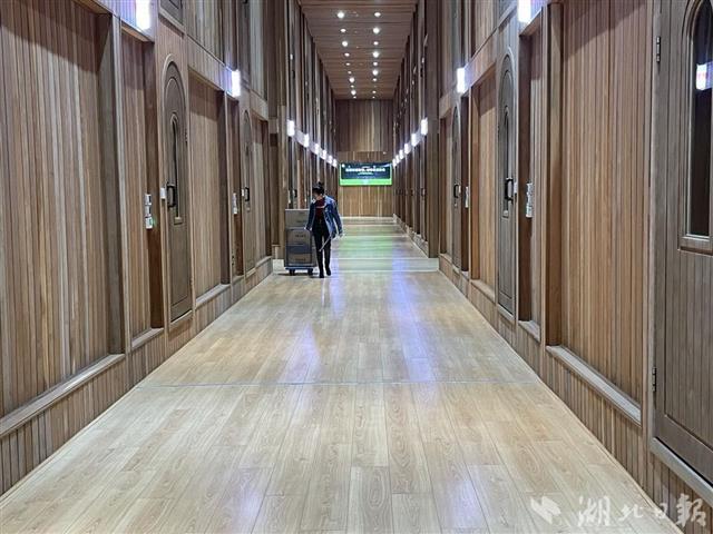 走進“洞茶木倉”,只見內(nèi)部空間被分割成一間間木屋。透過木門上的玻璃,可見木屋內(nèi)堆碼整齊的一箱箱青磚茶成品。木屋內(nèi),保持適宜青磚茶存儲的恒溫恒濕環(huán)境。一個木屋就是一個倉,“洞茶木倉”一共48個倉,每個倉可存放20噸青磚茶。
