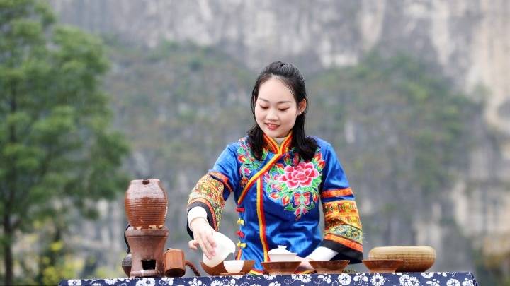2020年10月1日,重慶市黔江區(qū)在城市大峽谷景區(qū)舉辦中秋茶會。100多名茶藝師在當?shù)孛駱穲F演奏的《彩云追月》《花好月圓》《高山流水》等民樂聲中,為游客表演精湛的茶藝,讓游客在品茶香、賞民樂中祝福祖國,歡度中秋。